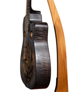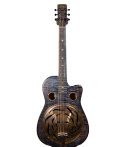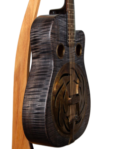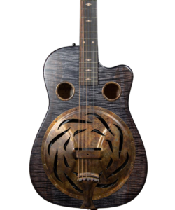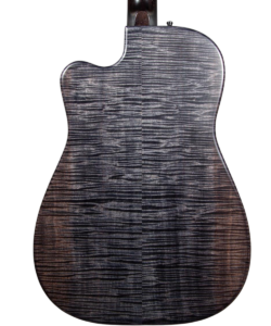 The Trailhead-E roundneck is a large body curly maple guitar with a small round over, cutaway, and ultra-thin satin finish. It comes standard in a tobacco, blue denim, or black ice finish.